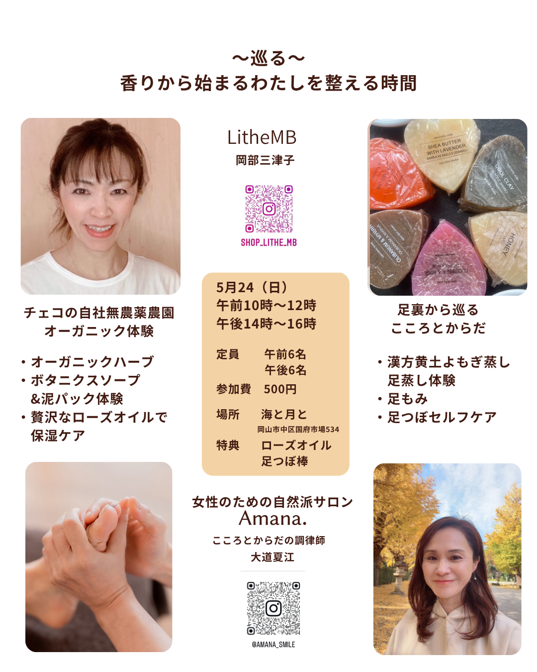 誰でもいつまでも元気に綺麗でいたいという気持ちがありませんか?いつも笑顔の方は何歳になっても輝いて見える。内側がきらきらと輝けば、外側からも自然とその輝きは伝わるはず。Lithe MBでは、笑顔で毎日を過ごせるよう、ピラティスやハーブを通して楽しみ方輝き方を数名のスタッフで真心を込めてお伝えしています。